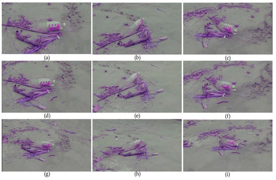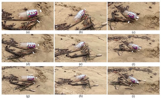 A total of 45 scenes were selected as spots to position the tripod. A total of nine images with varying distances and angles were captured in every scene. Therefore, the overall number of plastic waste images for each RGB and RGNIR dataset was 405. Figure 6 and Figure 7 show nine RGB and RGNIR images captured at the same scene.
