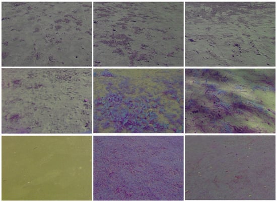 The background images are images with no plastic objects present. It was reported that adding background images could decrease false positives during training [32]. To effectively reduce false positives, it was recommended that about 10% of the overall datasets be background images. The background images were taken from the exact three locations as described in Section 4.1. The settings for capturing the background images were the same as described in Section 4.1, in which each background image consisted of nine unique positions. Figure 8 and Figure 9 show the samples of background images from RGB and RGNIR datasets, respectively.