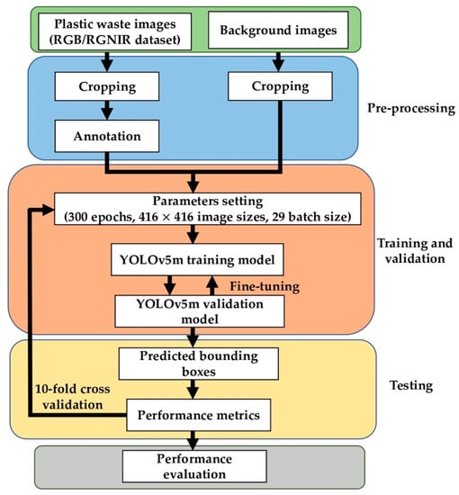 Figure 12 and Figure 13 show the block diagrams of the first and second experiments, respectively, carried out in this work. The block diagram of the third experiment is shown in Figure 14. All plastic waste, including the background images, underwent pre-processing before the training, validation, and testing phases. First, all the plastic waste images were manually cropped to remove the non-plastic objects. Regarding the background images, any plastic objects that appeared in them were eliminated by cropping out the section of the image that contained plastics, resulting in a clean background. Then, the plastic waste images were annotated by providing the bounding boxes around the targeted objects as ground truth using LabelImg. The background images were not labeled and were simply added to the training dataset.