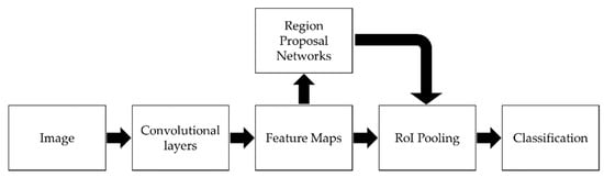 Faster Region-Based Convolutional Neural Network (R-CNN) is a deep learning-based algorithm used for object detection in computer vision. It has gone through a development process from R-CNN to Fast R-CNN, and finally to Faster R-CNN. Faster R-CNN is an object detection algorithm that combines the strengths of R-CNN and Fast R-CNN. It uses a Region Proposal Network (RPN) to generate object proposals directly from the convolutional feature map, eliminating the need for an external proposal method. The RPN generates object proposals by sliding a small network over the convolutional feature map and predicting whether an object is present at each sliding window location. Once the object proposals are generated, they are passed to the RoI pooling layer, which extracts features from each proposal and feeds them into a fully connected network for classification and bounding box regression [33]. Figure 17 illustrates the Faster R-CNN structure.