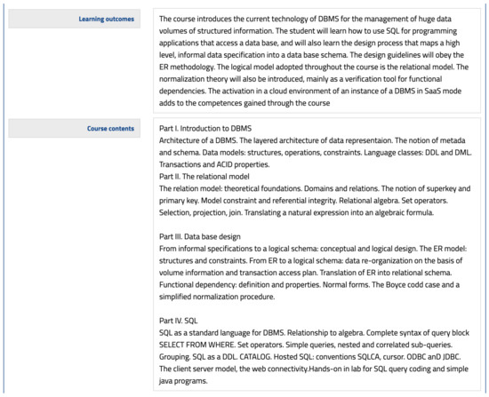 A course syllabus is a condensed description of a course, outlining its main characteristics and teaching objectives. Clearly, it contains an essential textual corpus that can be used in our approach to building the aforementioned dataset. Figure 1 shows an example of a syllabus from one of the courses taught by one of the authors of this paper.