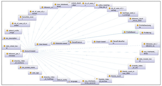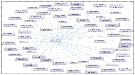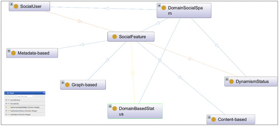To offer a thorough understanding of the core classes as well as the interconnected objects and data characteristics, Figure 2, Figure 3 and Figure 4 depict some of the classes in DSpamOnto. For example, Figure 2 shows the SocialFeature class which is a subclass of DomainSocialSpam class—the main class. SocialFeature class is subcategorized into content-based, graph-based, and metadata-based features. Each social feature might be domain-dependent or domain-independent, and if it is domain dependent, then it should be linked to one of the domains indicated in the ontology.