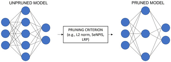 To illustrate the concept of pruning in CNNs, Figure 1 shows an example for NNs (neural networks) that can be easily extrapolated to CNNs. The original network (left) has three layers, as follows: an input layer with three neurons, a hidden layer with five neurons and an output layer with two neurons. Pruning does not affect the input layer or the output layer, so, for this example, it only affects the hidden layer. Let us assume that PR = 40%, which means that of the five neurons in the hidden layer, two neurons need to be pruned (i.e., removed from the network), leaving three neurons in the pruned network. Once the PR value is selected, the next step is to apply a pruning criterion, e.g., weight-based, such as the L1-norm or L2-norm. The pruned network (right) will then contain the neurons considered most important for the model, according to the pruning criterion selected.
