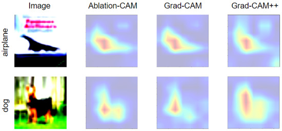 A second group of methods for the visualization and interpretation of CNNs corresponds to Grad-CAM and Grad-CAM++, which rely on the gradients flowing in the last convolutional layer to identify pixels of interest in the image [23,27]. However, Grad-CAM++ has shown better pixel identification when there are multiple objects of the same class. Unlike CAM, both Grad-CAM and Grad-CAM++ do not require network modifications for their computation. In addition, there are other methods that do not rely on the gradient, such as Ablation-CAM, which uses ablation analysis to determine the class-discriminative importance of individual feature maps [28].