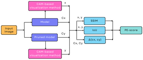 Taking into account the above, the PE-score is proposed, which is calculated from two similarity metrics and a confidence variance metric. The first two metrics are computed from the heatmaps of the original and pruned models: first, by a global similarity using , and second, by a specific similarity of the highlighted pixels using . The last one is performed by calculating the difference between the class confidence of the original model and that of the pruned model. In all three cases, the values range from 0 to 1. For both and , the best value is 1 and the worst is 0, while, for the confidence variation, the best value is 0 and the worst is 1. Therefore, the PE-score is within the range of 0 to 1, with the best value being 1 and the worst value being 0.