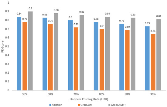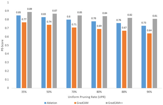 Finally, from the PE-score results per dataset and UPR value, it can be observed that the PE-score values obtained using the Grad-CAM++ visualization method are higher than those obtained using the Grad-CAM and Ablation-CAM methods. Thus, the PE-score value that guarantees the high reliability of the pruned model depends on the chosen visualization method.