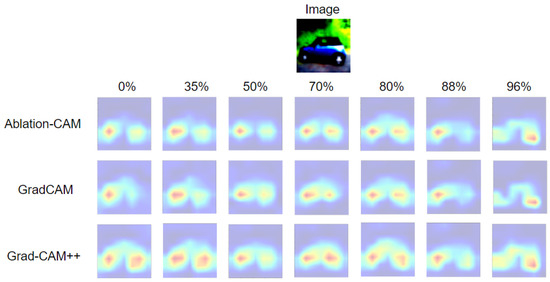As shown in Figure 6, the pixels that identify the unpruned model to determine the car class correspond to the tires. As the UPR value increases, the pruned model continues to focus mostly on the same pixels as the unpruned model, but the intensity of its activation decreases slightly. For example, the high-intensity area (red color) of the left tire of the car becomes medium-intensity (yellow color) when UPR = 96% and the visualization method is Grad-CAM++. In addition, it can be observed that for the same network, input image and UPR value, the Grad-CAM++ method is the one that best identifies the pixels belonging to the class (the most representative ones). For this reason, the PE-score obtained using Grad-CAM++ is superior to that with the other two methods.