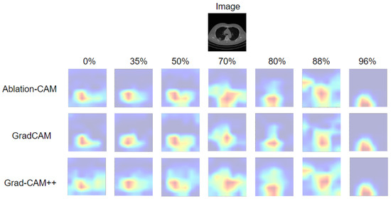 Figure 9 shows the explanation maps for an image from the COVID-19 dataset, using SeNPIS-Faster for the pruned models with six UPR values. Unlike the results obtained for the CIFAR10 dataset, the pixels activated after increasing the UPR value change significantly with respect to the pixels activated in the unpruned model. In other words, the model focuses on a different area of the image for decision making, which could be a “distractor” in the dataset and does not correspond to the representative patterns of the class. For this reason, if there are fluctuations in the PE-score value as the UPR increases, it is necessary to check the activation maps to verify the confidence of the pruned model, and to not only rely on the accuracy of the model as an indicator of its quality.