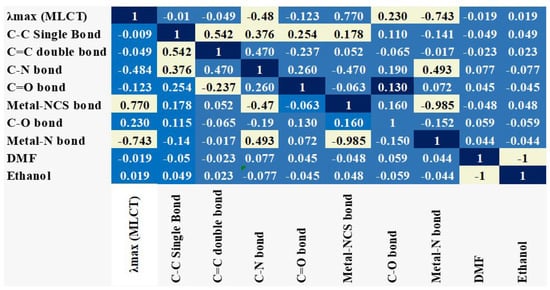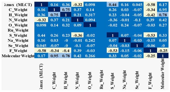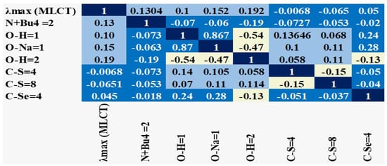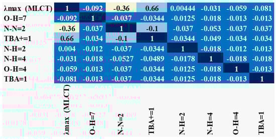 - Correlation matrix: This matrix shows the correlation between (i) λmax and all bonds in dye molecule (ii) λmax and other additional groups present in a dye structure (iii) λmax and atomic and molecular weight. The matrix represents the direct as well as inverse correlation. The value ‘0’ denotes no correlation, ‘1’ indicates complete and direct correlation. Whereas ‘−1’ shows that the given parameters have a complete and inverse correlation. The values increasing from 0 to 1 show an increasing degree of direct correlation. On the other hand, values approaching from 0 to −1 indicate the increasing degree of negative correlation between the parameters.