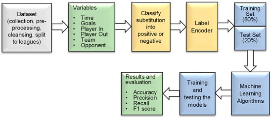 The Python scripts were uniquely designed and developed to manipulate the data obtained from an open-access database. These scripts were created to analyze the dataset entries and detect all the events from individual games. Once the events from each game were identified, the effectiveness of player substitutions was determined programmatically by examining the goal scoreline before substitutions and the goal scoreline at the end of the match. This process was performed for every substitution, and the resulting values were used to construct supervised machine-learning models using the Python sci-kit-learn module. As a result, well-known machine learning algorithms were applied in the sports domain, which is not commonly performed. This has the potential to make a significant impact on the widely popular sport. The innovative approaches to data collection, design, manipulation, and implementation can pave the way for future research. The detailed steps of technical work are presented in Figure 1.