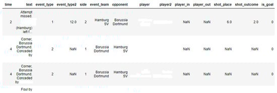 Data acquired from various sources may contain unwanted or irrelevant information. Data cleansing is the process of modifying the data according to the research requirements [26]. The ‘events.csv’ and ‘ginf.csv’ datasets were combined to include the league country names in each event. To conduct the analysis, the data from the different leagues were separated. Analyzing all 941,009 events together was not a viable option, as the substitution data would not be meaningful when applied to the ML models [4]. Consequently, the dataset was divided into five subsets, one for each league, based on the league country. After splitting, each dataset contained data from six seasons of a single European league. A sample of the pre-processed dataset is presented in Figure 2.