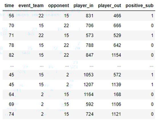 To protect the identity [27] of the players, data masking techniques [28] were used to replace the names of the players with numbers. The Python module ‘LabelEncoder’ was used to assign a unique number to each player. For example, in the France league data from the four seasons, 1277 players were substituted in a total of 2076 matches, for a total of 11,576 substitutions. To ensure confidentiality, the names of the substitute players were masked with unique numbers using data masking and label encoding methods. Figure 3 presents a sample of the manipulated and masked data.