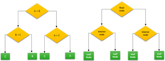 In Figure 4, The yellow boxes indicate decision nodes, which are features of the dataset, while the green box represents the leaf node, which represents the outcome. The decision tree model has three possible outcomes: A, B, and C. The outcome is determined by the features mentioned as interior nodes in the dataset.