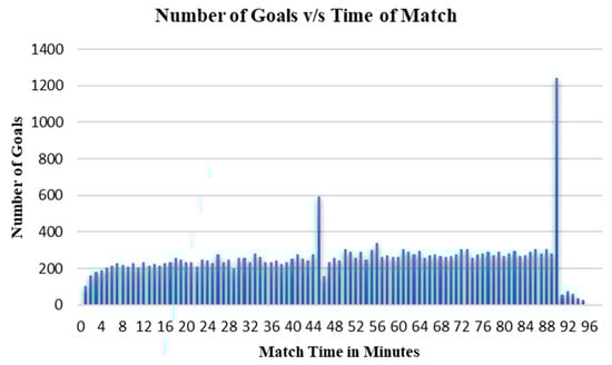 An analysis of the goals scored in the German league showed that the number of goals scored per minute was relatively steady throughout the duration of the match, with a slight increase in the injury times of each half (Figure 5). It is noted that most of the goals were scored in the extra/injury time in both halves.