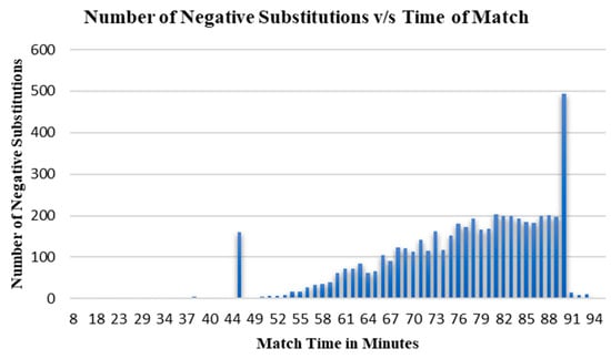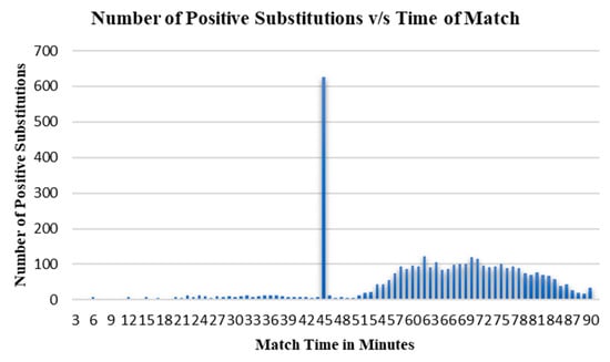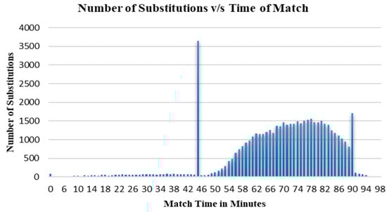 An analysis of the substitutions in the German league (Figure 6) revealed that there were a large number of substitutions that occurred in the first and second halves of the match. Most of the substitutions happened after the 60-min, and many substitutions are observed during the extra/injury time of the second half.