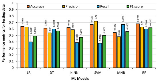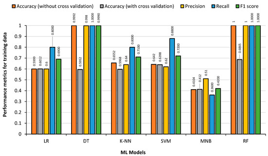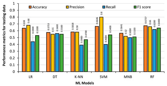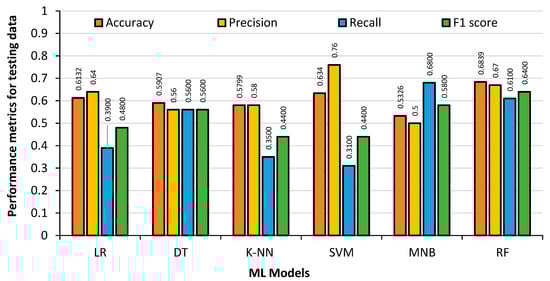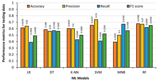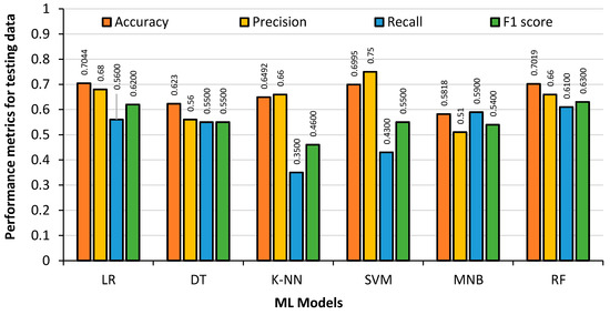 In this work, the value ‘positive_sub’ predicts if the substitution created a positive impact or negative impact. For example, the accuracy of LR on test data was 70%, which means that the model was able to predict 70 instances of ‘positive_sub’ correctly in the test data and 30 predictions were incorrect on a sample of 100 test data entries. Accuracy is a useful metric for evaluating the performance of ML models, however, it can be misleading if the classes in the dataset are imbalanced. For example, if the dataset has 95% of “positive_sub” as ‘1’ and only 5% as ‘0’, then a model that always predicts “1” would have an accuracy of 95%, even though it is not making any correct prediction. In this case, other metrics such as precision, recall, and F1 score, explained in the following sections, should be considered to obtain better output-related information.