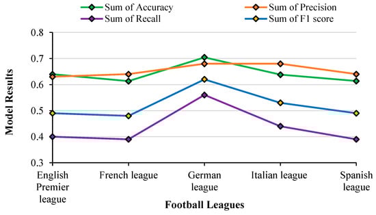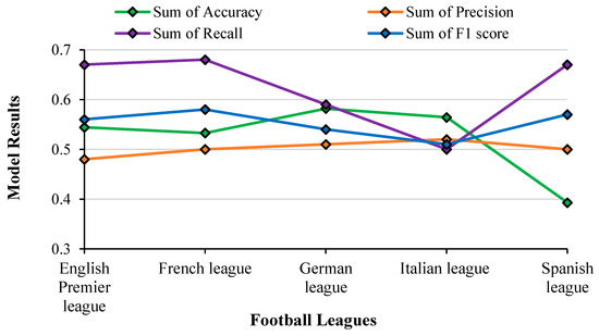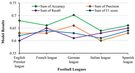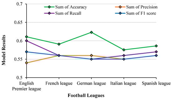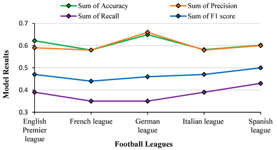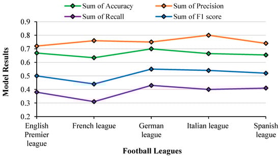 The results of the RF classifier model showed the best relationship between Accuracy, F1 score, Precision and Recall across almost all leagues, which represents that the model’s performance on the training or validation data is better and consistent across these different evaluation metrics. This also shows that the RF Classifier model demonstrates a large number of correct predictions with a high degree of precision.