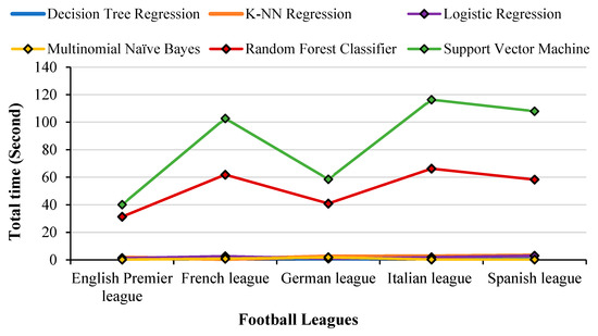 As the elements in the input dataset increase, the total time taken also increases by the SVM and RF classifier. The total time taken found was worst for SVM in the Italian league, where it took up to 2 min for the entire process to complete. MNB took less total time which was just 3.3 s to calculate values for all the leagues. It is also seen that the total time including training, testing and formatting time increases due to increasing the size of the dataset.