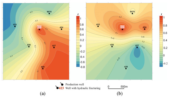 Martyushev et al. [23] expounded the use of machine learning (ML) for the predictive optimization of reservoir pressure in directional hydraulic fracturing (DHF) carbonate reservoirs. Their study considered hydraulically fractured Well 423 on the D3fm oil deposit site, as presented in Figure 3. The focus of ML modeling was based simply on the interactions and influences of the neighboring wells (9070, 430, 424, 427, 433) on Well 423, before and after DHF. The relationship for the model was referred to as the coefficient of correlation (r), as demonstrated in Figure 3. The result of their research indicates that the higher the correlation coefficient, the more accurate the reservoir pressure prediction, and as demonstrated, Well 423, before and after DHF, presents increased pressure levels, indicating a red region, and low reservoir pressures correspond to a lower correlation coefficient, indicating a yellow and blue region.