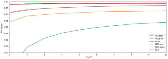 Adaptive moment estimation (Adam) [30] is an extension of SGD [31]; whereas, the weights of the entire network under training are optimized by a single learning rate, Adam, on the other hand, concentrates on upgrading each network’s weights. Based on its wide usage, several researchers have indicated it as the benchmark for deep learning and standard optimization approaches, since it does not support overtime computation and requires less memory for computation, thereby reducing the entire cost of computation. While there has been overwhelming research curiosity for better adaptation of deep learning optimizers, previous studies in the research community [32,33], few intelligent applications based on the root mean square propagation (RMSprop) optimizer have been published. This adaptive optimizer takes its roots from RProp, known as resilient backpropagation. Since RProp contradicts the theory behind stochastic gradient descent, RMSprop was developed as an extension of RProp. As a result, just as Adam focuses on each network’s weight, so does RMSprop. In this case, a weight’s specified learning rate is gradually split by the size of its most recent gradients, averaged over time, and determined using the mean square method. Figure 5 presents an illustrative performance of the current study’s choice of gradient and adaptive optimizers for the manipulation and tweaking of the synthetic fracking dataset to optimize the predictive petroleum industry. The previous neural network modeling, as conducted by [34], defined an input shape of 28, 28, 1 and upon successfully splitting the improvised data at a dtype float 32, built its model using Keras Sequential, and with activation functions set to ReLU, and SoftMax introduced a loss function of cross entropy under the following optimizers, seen in Figure 5. It is empirically significant to note that the resulting experiment indicates that the Adam optimizer achieved the best performing algorithm, as it is followed by RMSprop and SGD.