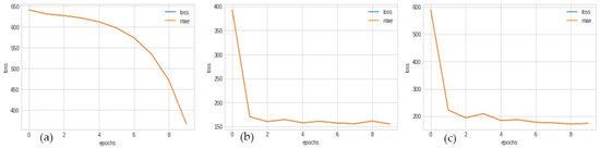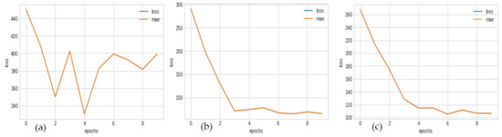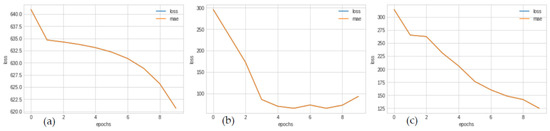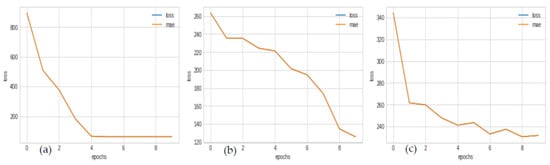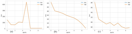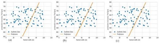 Fracture width linear regressor model and optimizer performances; (a) SGD final loss = 255.78, (b) Adam final loss = 251.87, (c) RMSprop final loss = 249.91.