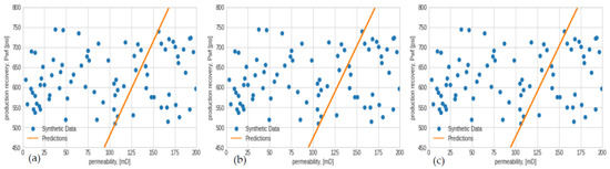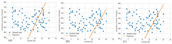 Production recovery prediction analysis engaged a linear neural network regressor utilizing the Keras sequential model for the synthetic data. The model was compiled with an input shape of 1 and a linear activation, unlike ReLU, as indicated for the non-linear regressor mentioned earlier. However, while the study maintained its reliability, the model was compiled with the same loss functions (MAE) and selected optimizers for training the model with a 0.01 learning rate and an epoch of 100. Figure 16, Figure 17, Figure 18, Figure 19 and Figure 20 illustrate the predictive version of the linear regression.