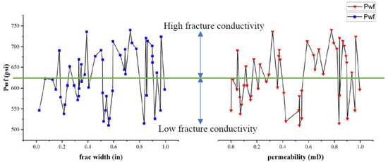 The synthetic data emanating from CMG modeling was shuffled and indexed to read production recovery, as demonstrated in Figure 21. However, the model used for the earlier prediction indicated that, out of the entire 2000 synthetic datasets replicated, the Adam optimizer prediction, with a 101.22 loss function, was at best 80.24% accurate. Production recovery was based on the flowing bottom-hole pressure; hence, a plot to determine the fracture conductivity where the propped fracture tends to convey formation fluids into the wellbore is demonstrated in Figure 22.
