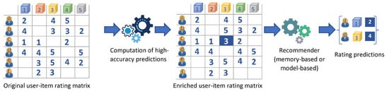The present work incorporates the aforementioned knowledge into a technique for enhancing rating prediction quality in low-density CF datasets. More specifically, the proposed technique entails a preprocessing step that computes predictions for all unrated items, for each user. Subsequently, the rating predictions, which are deemed of high accuracy (considering the factors identified in Margaris et al. []), are added to the low-density rating dataset as additional ratings, effectively increasing the dataset density. Once this density enrichment step has concluded, any algorithm, either memory-based or model-based, can be applied to the updated dataset to generate rating predictions and recommendations. Figure 1 outlines the proposed approach. The present paper focuses on the computation of the high-accuracy prediction phase, which effectively constitutes a preprocessing step that is applied to the user–item rating matrix.