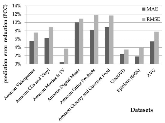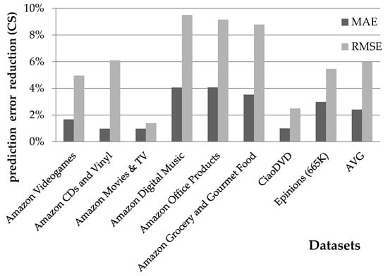 - Then, the rating prediction coverage enhancement (RPCE) for the rating prediction algorithm RP on dataset D is defined aswhereas the rating prediction error reduction (RPER) considering the MAE and RMSE error metrics is computed as shown in Equations (5) and (6), respectively: