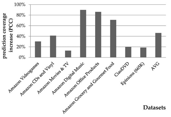 Figure 4 depicts the rating prediction coverage gains when user similarity is calculated through the PCC metric.