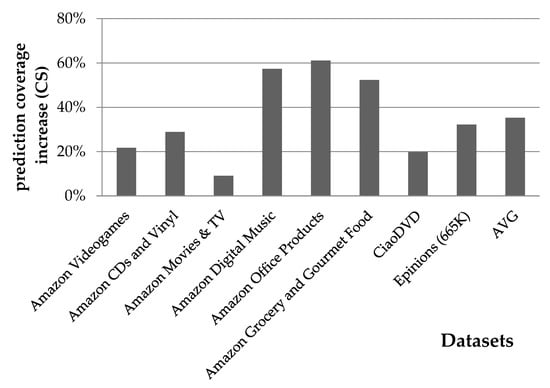 Similarly, Figure 5 depicts the respective rating prediction coverage gains when the user–user similarity metric applied is the CS. The proposed algorithm, under the CS metric, achieves an average rating prediction coverage enhancement of 35.3%, ranging from 9.1% for the case of the Amazon Movies & TV dataset, to 60.8% for the case of the Amazon Office Products dataset. Analogously to the previous case (when the PCC metric is used), for the Amazon datasets, the rating coverage increase achieved by the proposed algorithm was found to be monotonically decreasing with the datasets’ initial coverage. In particular, the Amazon Movies & TV dataset had the highest initial coverage (90.8%), whereas the Amazon Office Products dataset had the smallest initial coverage (59.8%). Nevertheless, the CiaoDVD and Epinions datasets exhibit reduced coverage improvement, compared to Amazon datasets with similar initial coverage, an issue that will be explored in our future work.