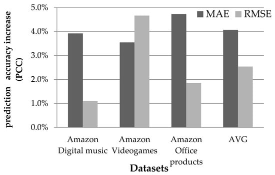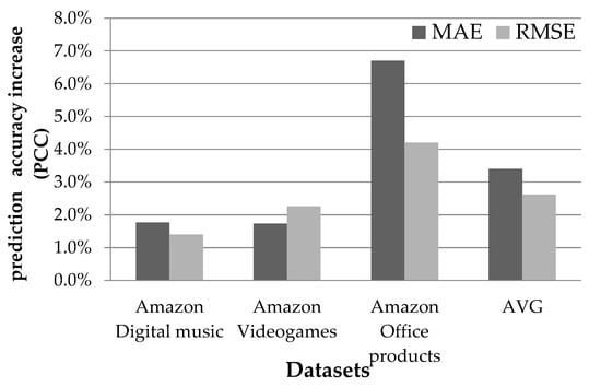 Figure 7 illustrates the improvements obtained in rating prediction accuracy through the application of the proposed algorithm in the same three Amazon product datasets shown in Figure 7 [] when rating predictions are computed using the matrix factorization algorithm. In Figure 8 we can observe that the average MAE improvement is 4.1%, ranging from 3.5% for the Videogames dataset to 4.7% for the Office products dataset, whereas the corresponding average improvement for the RMSE metric is 2.5%, ranging from 1.1% for the Digital Music dataset to 4.7% for the Videogames dataset.
