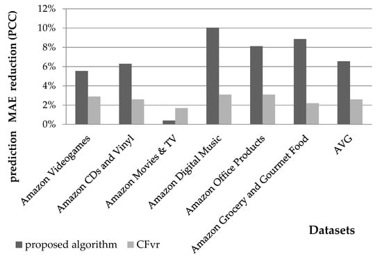 Considering the aspect of rating prediction accuracy, the presented algorithm achieves an average MAE reduction of 6.6%, whereas the CFVR achieves an MAE reduction of 2.6%, i.e., the presented algorithm exceeds the performance of CFVR over 2.5 times. The respective RMSE reductions these algorithms achieve are 9.1% and 3.4%, respectively (for both metrics, the plain CF algorithm is considered as the performance baseline against which error reductions are calculated). Figure 9 and Figure 10 depict the comparison between the two aforementioned algorithms at both average and individual dataset levels; the proposed algorithm consistently outperforms CFVR in all cases, except for the case of the MAE metric on the Amazon Movies & TV dataset. However, we notice that in this dataset the presented algorithm achieves a higher reduction in the RMSE metric than CFVR, due to the fact that the proposed algorithm corrects a number of large prediction errors, which are more severely penalized when using the RMSE metric. For conciseness, only figures concerning the algorithms’ performance when using the PCC metric are listed; however, similar observations hold for the results obtained when the CS metric is used instead.