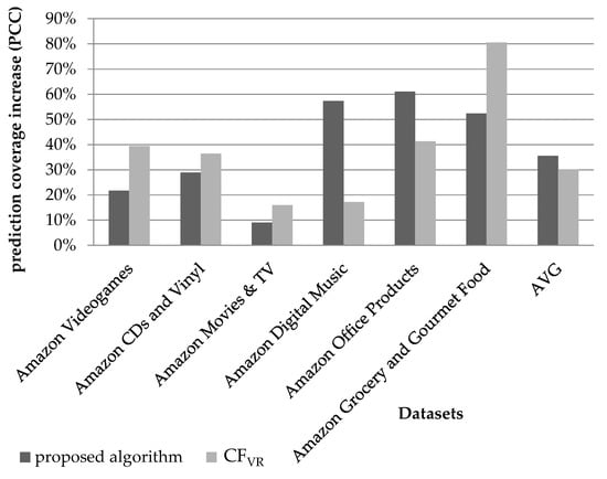 Furthermore, we compare the performance of this algorithm against the performance of the CFVR algorithm proposed by Margaris et al. [], which has been found to surpass the performance of other CF rating prediction algorithms (e.g., [,]). In this comparison, only the Amazon Datasets Videogames, CDs and Vinyl, Movies & TV, Digital Music, Office Products, and Grocery and Gourmet Food will be considered, since they constitute the intersection of the datasets utilized for performance evaluation in [] and the current paper.