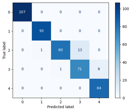 After obtaining the best model for predicting the Flow variable, the next step was to analyse the specific results of the chosen model which, in this case, was MLP. To do so, we computed the confusion matrix. An illustration of the results can be found in Figure 3. This figure illustrates the points in which the classifier was not able to predict properly. In most cases, the classes with more misclassified points are classes 2 and 3, and sometimes class 4; seldom do we find class 0 or 1 misplaced. This is a direct result of the oversampling method carried out. In fact, if this technique was not applied, those minority classes would have been misclassified.
