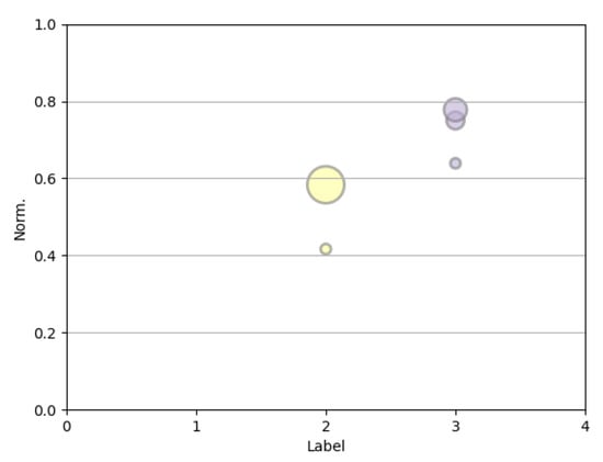 We can refer to Figure 4 to observe the relationship between the predicted labels and the true label. The abscissa axis is the associated label, the ordinate axis displays the normalised value of the Flow variable, and the colour and the horizontal lines define each label within the same range. As mentioned previously, the MLP’s misclassified points in Figure 4 are closer to the boundaries. For instance, there are 13 points labelled as a large yellow dot in class 2, which is very close to the boundary between class 2 and class 3 and were classified as a label 3. Similarly, the small yellow point indicates that it is near class 2 and was incorrectly classified with that label. The situation is also similar for the purple circles of label 3. Among the eight points that were misclassified, five out of eight are in the limits between the two classes, 3 and 4. This is the highest point. The second point, which is slightly smaller, had three erroneous predictions. This is not located exactly on the class boundary but rather the second-closest location, as it is the case for the last point, which represents one instance classified as a class 2.