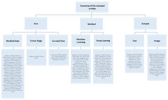 Taxonomy of the reviewed articles on predicting colorectal cancer using AI [5,9,10,19,20,21,22,38,39,40,41,42,43,44,45,46,47,48,49,50,51,52,53,54,55,56,57,58,59,60,61,62,63,64,65,66,67,68,69,70,71,72].