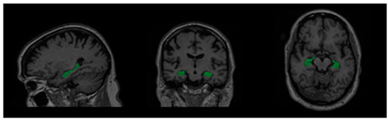 From left to right: sagittal, coronal, and axial view of an MRI volume. Left and right hippocampi are highlighted in green.