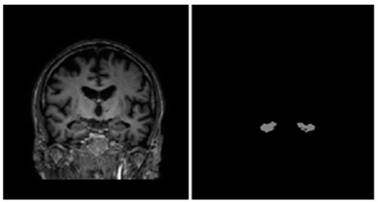 In 2013, a joint project between the European Alzheimer’s Disease Consortium (EADC) and Alzheimer’s Disease Neuroimaging Initiative (ADNI) came up with a standardized protocol for manual segmentation of the hippocampus from MRI scans known as the EADC-ADNI Harmonized Protocol (HarP) [32]. Further follow-up studies showed a significant increase in inter-rater intraclass correlation coefficient (ICC) when experts performing manual segmentations switched to using HarP [8,33]. HarP was also pathologically validated by comparison of HarP segmentations and post-mortem MRI scans of AD patients [34]. Upon establishing the validity of the HarP segmentation method, the EADC-ADNI team also recognized that many automated segmentation algorithms required a large sample of brain MRI volumes and their corresponding hippocampus segmentation masks (segmented with HarP) for training. Therefore, a dataset consisting of 135 brain MRI volumes complete with the benchmark HarP-segmented hippocampus masks was created for use in further research [35]. More information regarding the EADC-ADNI HarP data (including steps to download them) can be found in [36]. It should be noted that for every brain MRI volume, there were two hippocampus segmentation masks corresponding to the left and right hippocampus. A sample coronal view of a brain MRI volume and its corresponding combined hippocampus masks can be seen in Figure 4.