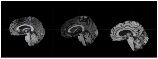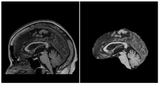 Removal of irrelevant tissues such as those of the eyes, nose, and mouth from brain MRIs, also known as skull-stripping, is essential in reducing the amount of noise within each MRI volume. Iglesias et al. [42] proposed an automated skull-stripping algorithm known as ROBEX that was shown to produce reliable segmentations of the tissues belonging to the brain. With the ROBEX algorithm, all MRI scans in the dataset were skull-stripped to obtain volumes containing just the brain tissues; an example is shown in Figure 7.