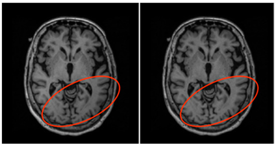 In order to ensure that majority of the brain MRI volumes were well aligned and properly registered, these 15 subjects and their volumes were removed from the dataset. Therefore, the final data consists of the MRI volumes and hippocampus masks of 115 subjects. The next step of pre-processing performed was field inhomogeneity correction, also known as bias field correction. During the acquisition of an MRI scan, the magnetic field weakens as it encounters brain tissue, thereby causing inconsistencies in the intensities through the volumes (even for the same tissue types) [37]. These inconsistencies can make it difficult for the models to accurately detect the boundaries of different tissue types. Therefore, the N4ITK algorithm was used to perform field inhomogeneity correction for all volumes in the dataset [41] as shown in Figure 6 below.