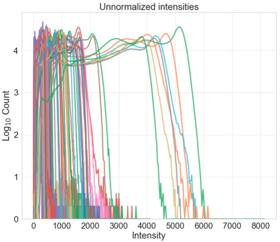 Due to differences in the types of scanner used and the configuration of each MRI scan, volumetric MRI data can have very different ranges of intensity values. The intensity values of every MRI volume in the HarP dataset is shown in Figure 8: each line represents the intensity value distribution of each MRI volume. Although every MRI volume had a similarly shaped intensity distribution, the ranges of the intensity values differed greatly. Some MRI volumes had maximum intensity values in the 1000s range, while others had maximum intensity values in the region of 6000.
