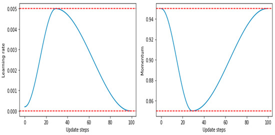 In the experiments, this policy was slightly modified such that a cosine annealing schedule was used for increasing the initial learning rate to LRmax (i.e., the first half of the cycle), after which the learning rate was similarly decreased with a cosine annealing schedule from LRmax to zero. Simultaneously, a cosine annealing schedule was also used to decrease momentum from an upper bound of 0.95 to a lower bound of 0.85 in the first half of the cycle then similarly raised back to the upper bound. Figure 11 below shows the simulated adjustments in learning rate and momentum as training progresses. Such an approach has been shown by research to yield better results [55].
