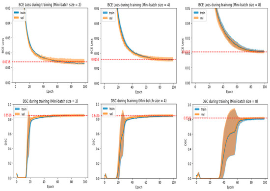 - If there is an alternative mini-batch size and number of epochs that greatly reduces training time without reducing model performance significantly, then that particular set of hyperparameters will be chosen. After observing some initial experiments, we empirically defined a model’s performance to be significantly affected if the average validation loss increased by more than 0.0004 or the average validation DSC decreased by more than 0.004.