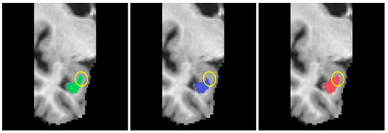 Sample coronal slices of predicted right hippocampus segmentation masks overlaid on the brain MRI in the order of ground truth (green), EnsembleUSegNetR (blue), and 3D U-NetR (red) from left to right. Yellow circles show the hippocampus region missed by EnsembleUSegNetR.