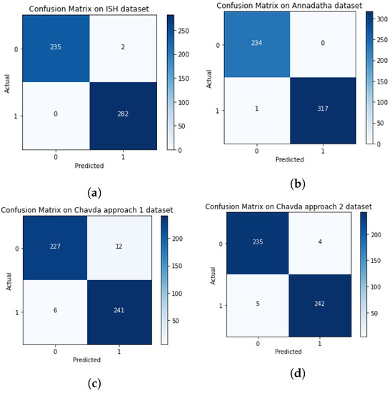 In addition, Figure 7a–d presents the confusion matrix of the proposed model on ISH, Annadatha, Chavda approach 1, and Chavda approach 2, respectively.