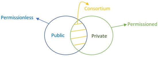 46]. This blockchain type is a hybrid between public and private blockchains, as shown in