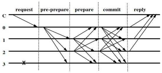 - Castro, M.; Liskov, B. Practical Byzantine fault tolerance. In Proceedings of the Third Symposium on Operating Systems Design and Implementation (OSDI’99), New Orleans, LA, USA, 22–25 February 1999; USENIX: Berkeley, CA, USA, 1999; Volume 99, pp. 173–186. [Google Scholar]