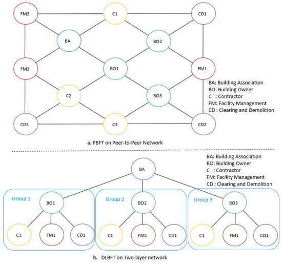 28]. However, more layers will produce more latency to reach a consensus. This could be ineffective for a complex situation such as the BIM information exchange. Thus, in this research, we proposed to reduce communication complexity using a Double-Layer Byzantine Fault Tolerance (DLBFT) algorithm that runs on a two-layer network. The network is divided into groups of four nodes. Each group consists of one node in Layer 1 and three other nodes in Layer 2. The BFT algorithm is run within nodes on Layer 1 and within groups. Thus, communication is limited among Layer 1 nodes and groups; it reduces the overall communication complexity. As a result, this algorithm has the potential to improve scalability by a horizontal expansion, which promotes the overall performance of the system by increasing the number of nodes.