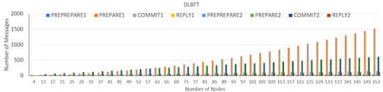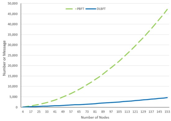 In addition, the increased rate of messages exchanged in the PBFT algorithm tended to be exponential, confirming that there was a high number of messages exchanged, while DLFBT tended to be linear. The higher the number of participating nodes in the network, the more significant the difference in the number of messages exchanged between the two algorithms. In this study, the threshold was shown after more than 100 nodes [